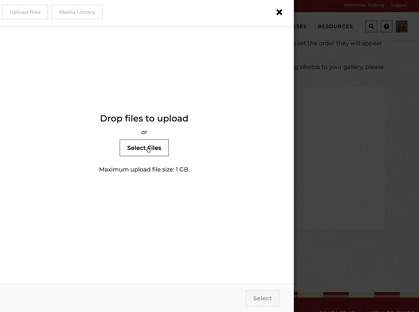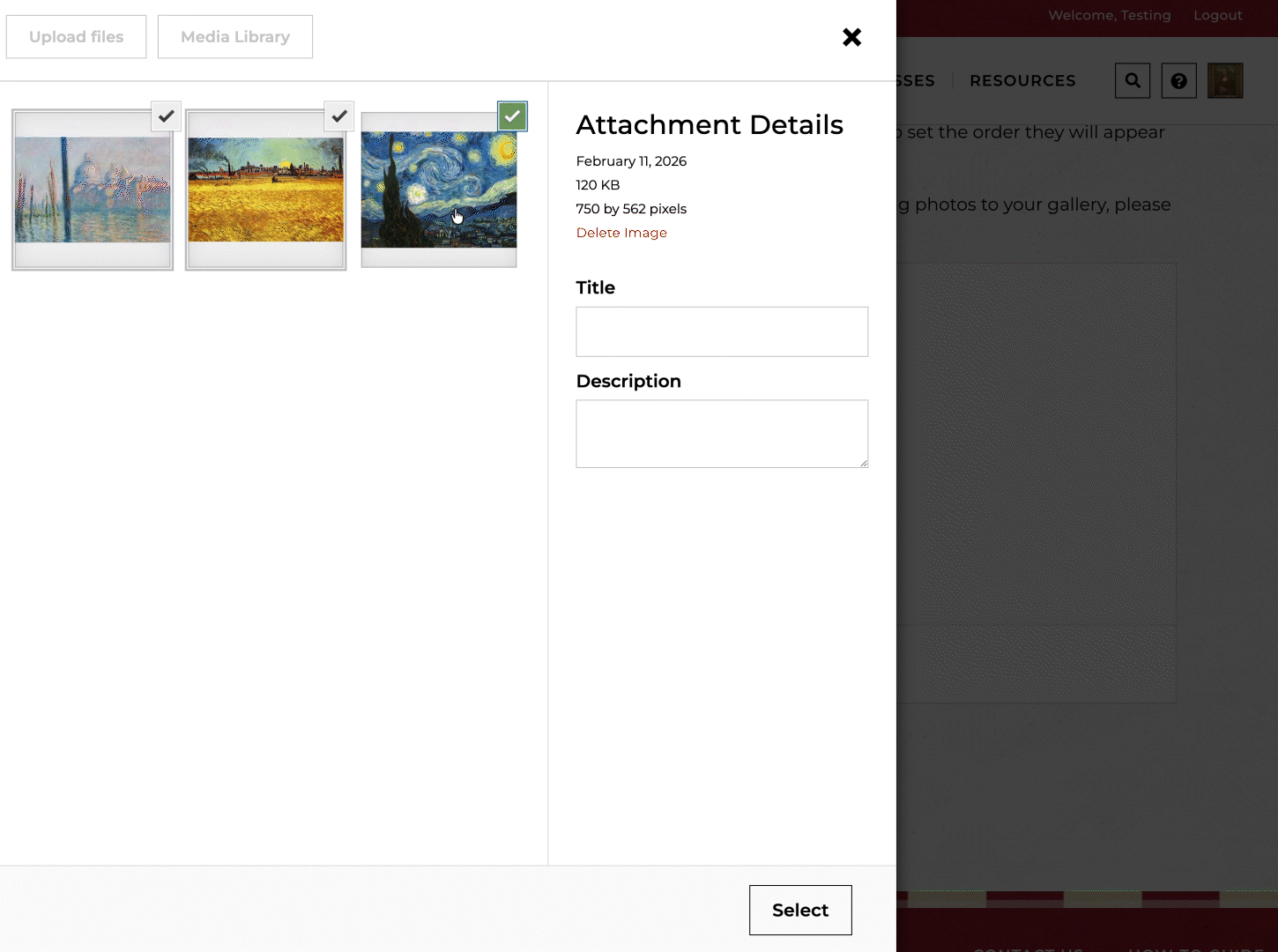 4. Once you have added all of the artwork information, make sure to select all of the images you would like to be displayed in your gallery. The images that have been selected will display a checkbox in the top-right corner of the thumbnail. After all of your images are selected, click ‘Select’.